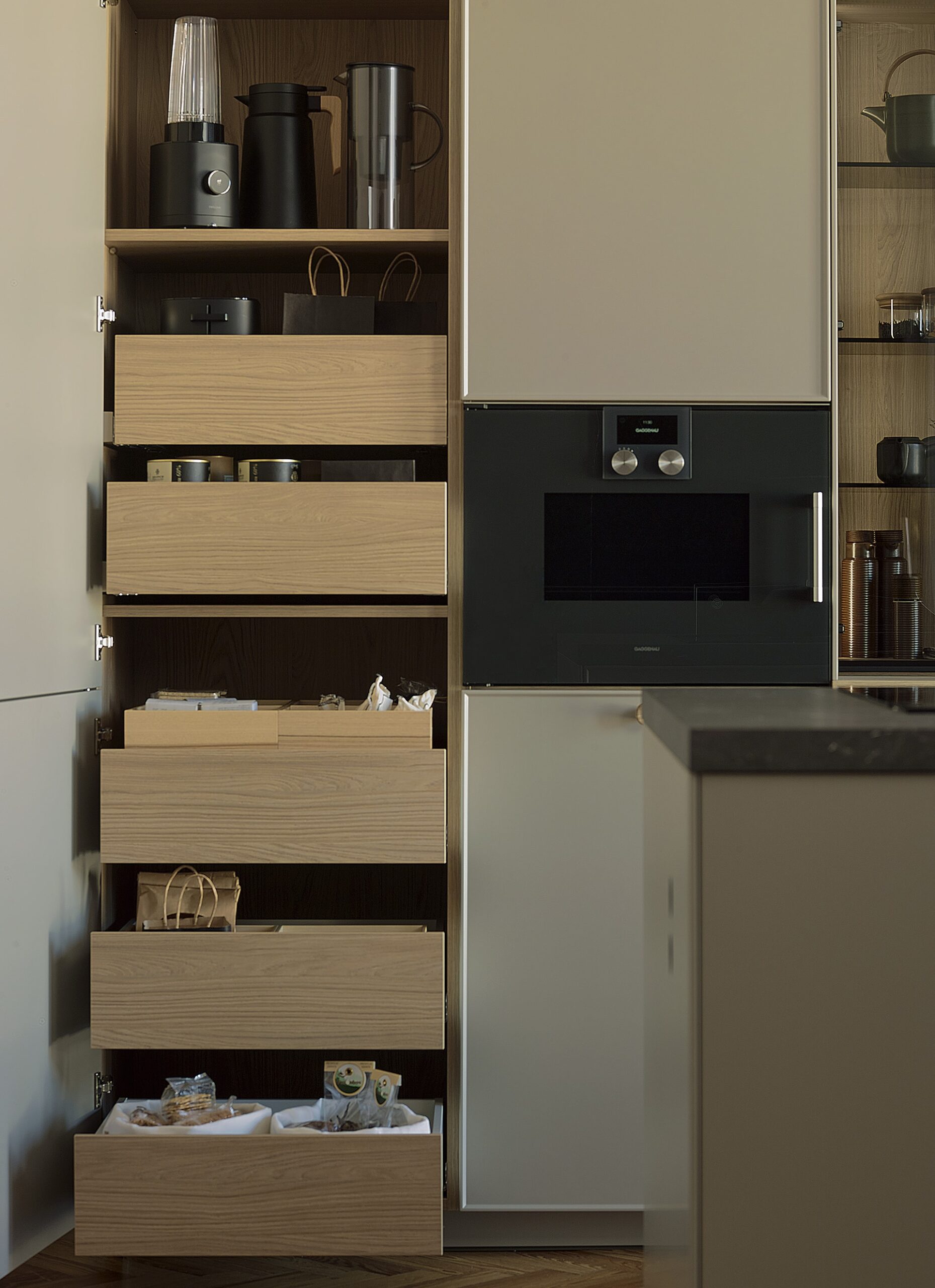 La paleta de colores basada en grises, crudos y maderas naturales aporta calidez y luminosidad. Los interiores de los muebles en madera, combinados con vitrinas de aluminio negro, vidrio ahumado y estantes de cristal, generan una atmósfera sofisticada y acogedora. La iluminación de la vitrina transforma el almacenamiento en un elemento estético, ideal para mostrar vajilla o decoración de manera elegante.